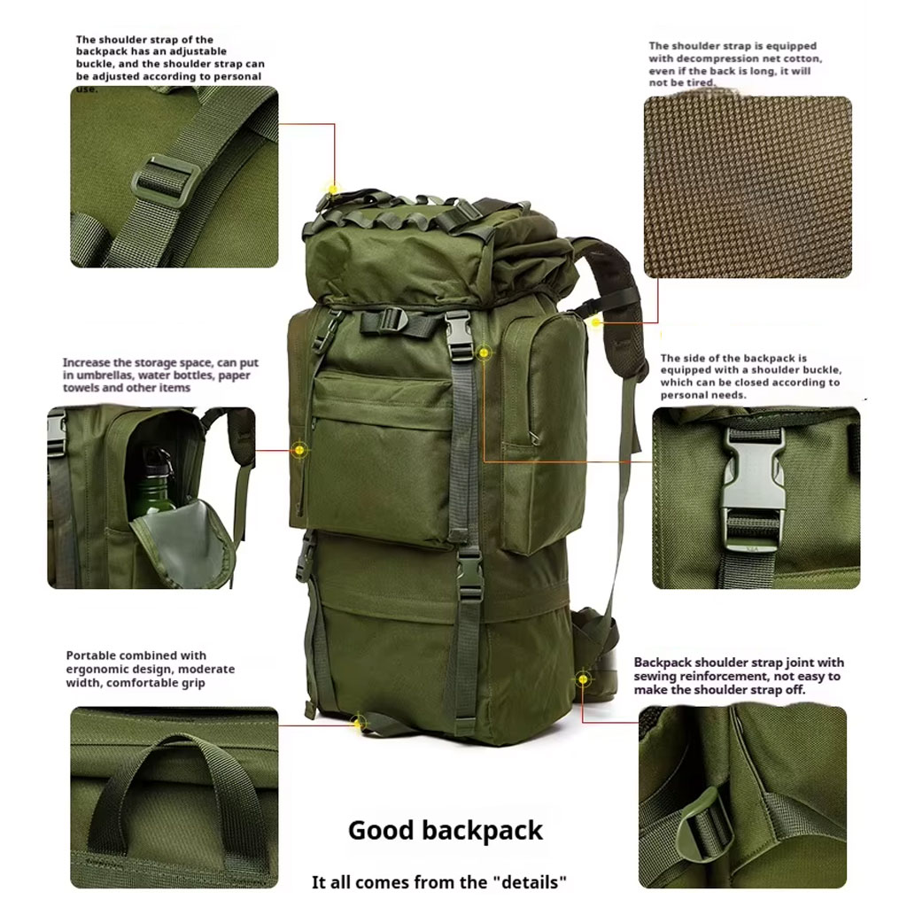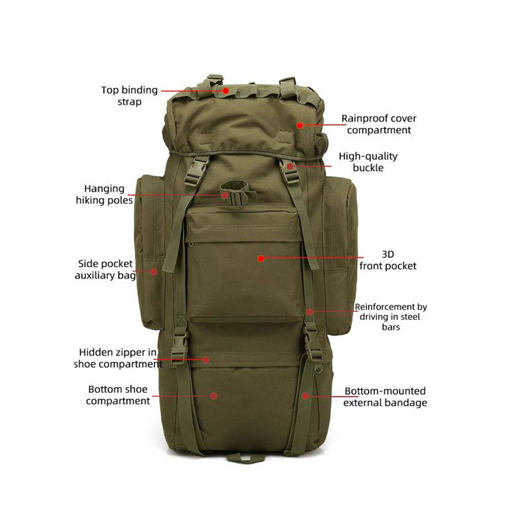 En praktisk og slidstærk vandrerygsæk på 65 liter, ideel til længere vandreture, trekking, camping og rejser. Fremstillet af 900D Oxford-stof, som sikrer høj holdbarhed.