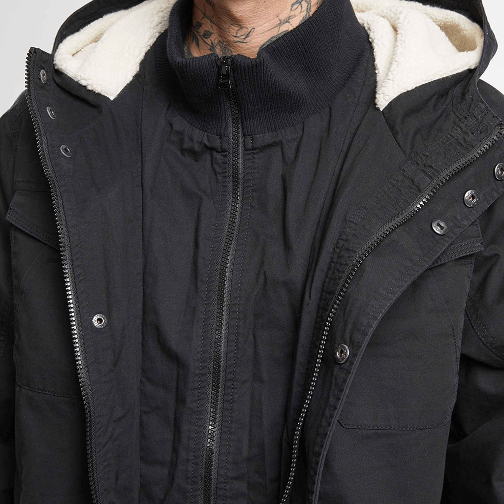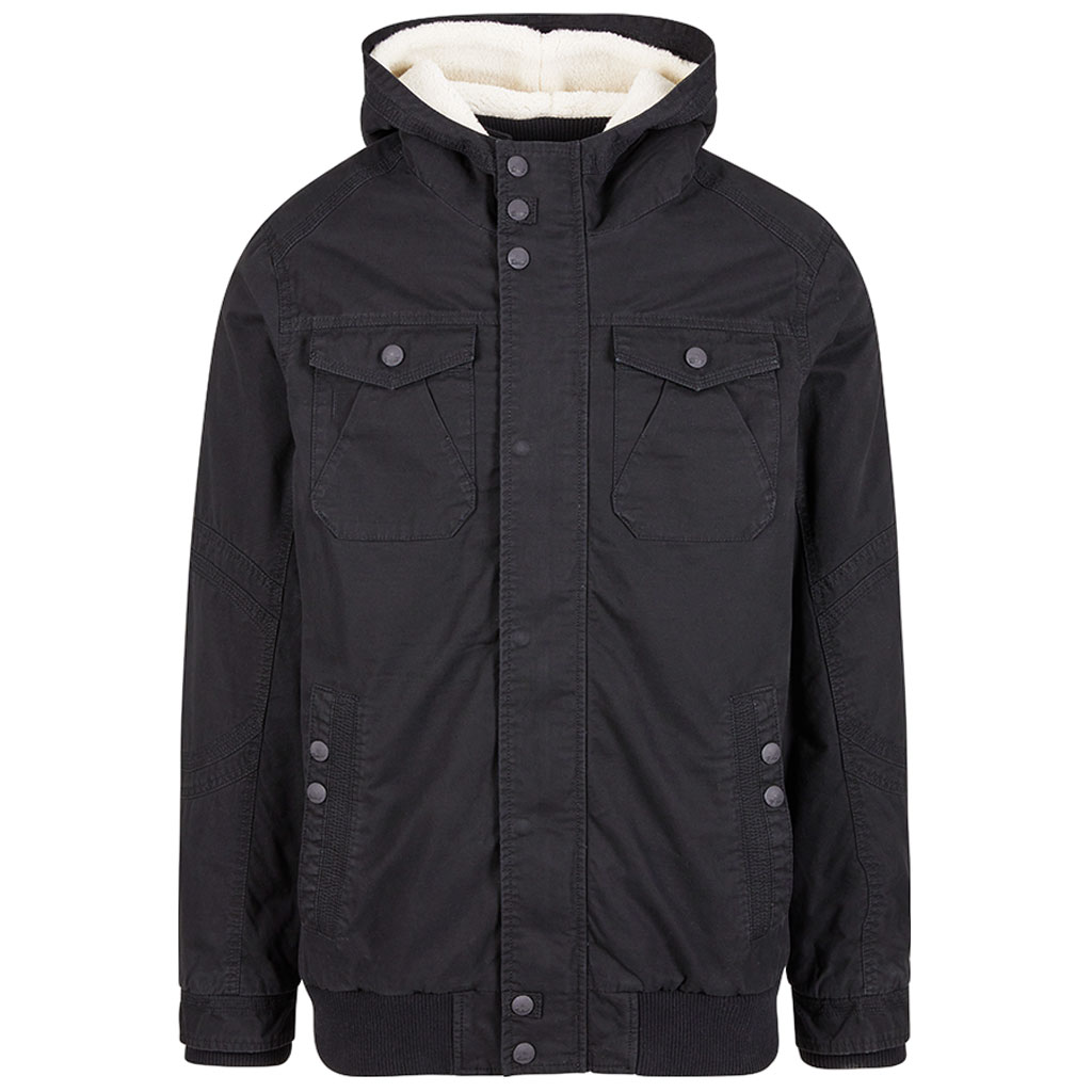 Med sitt slitstarka bomullstyg och det varma teddyfodret på insidan får du en jacka som står emot kyliga dagar utan problem. Den höga kragen och den fodrade huvan ger extra skydd när vädret skiftar, och muddar vid ärmar och nederkant håller kylan ute där det märks som mest.